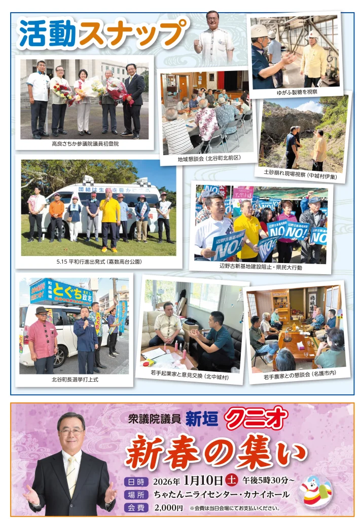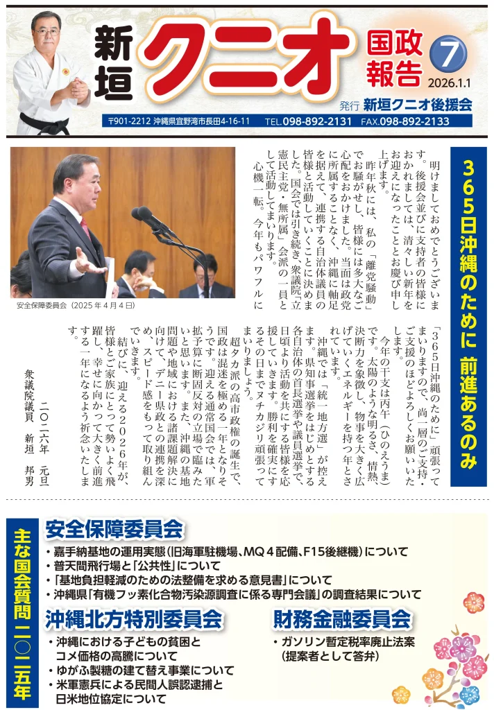 新垣クニオ後援会ニュース7号 2025 12/27 最新のお知らせ 2026年1月1日 最新のお知らせ 10/27(木)新垣邦男 この記事を書いた人 admin 関連記事 10/27(木)新垣邦男 2024年12月9日 日米共同総合演習 2024年12月9日 コメント コメントする コメントをキャンセルコメント ※ コメントは日本語で入力してください。(スパム対策)名前 ※ メール ※ サイト 次回のコメントで使用するためブラウザーに自分の名前、メールアドレス、サイトを保存する。 CAPTCHA コード 私はロボットではありません。 email confirm* post date* 日本語が含まれない投稿は無視されますのでご注意ください。(スパム対策)